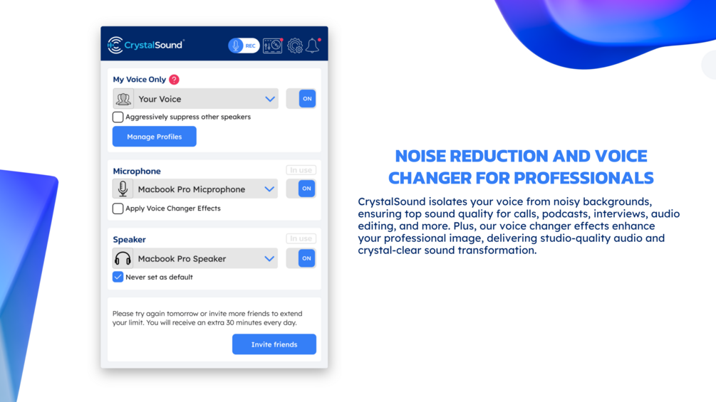CrystalSound is a desktop app that lets you reduce noise and record your call in real-time. You can use it with any app that lets you talk or record audio, such as Teams, Zoom, Meet, Loom, or Audacity.